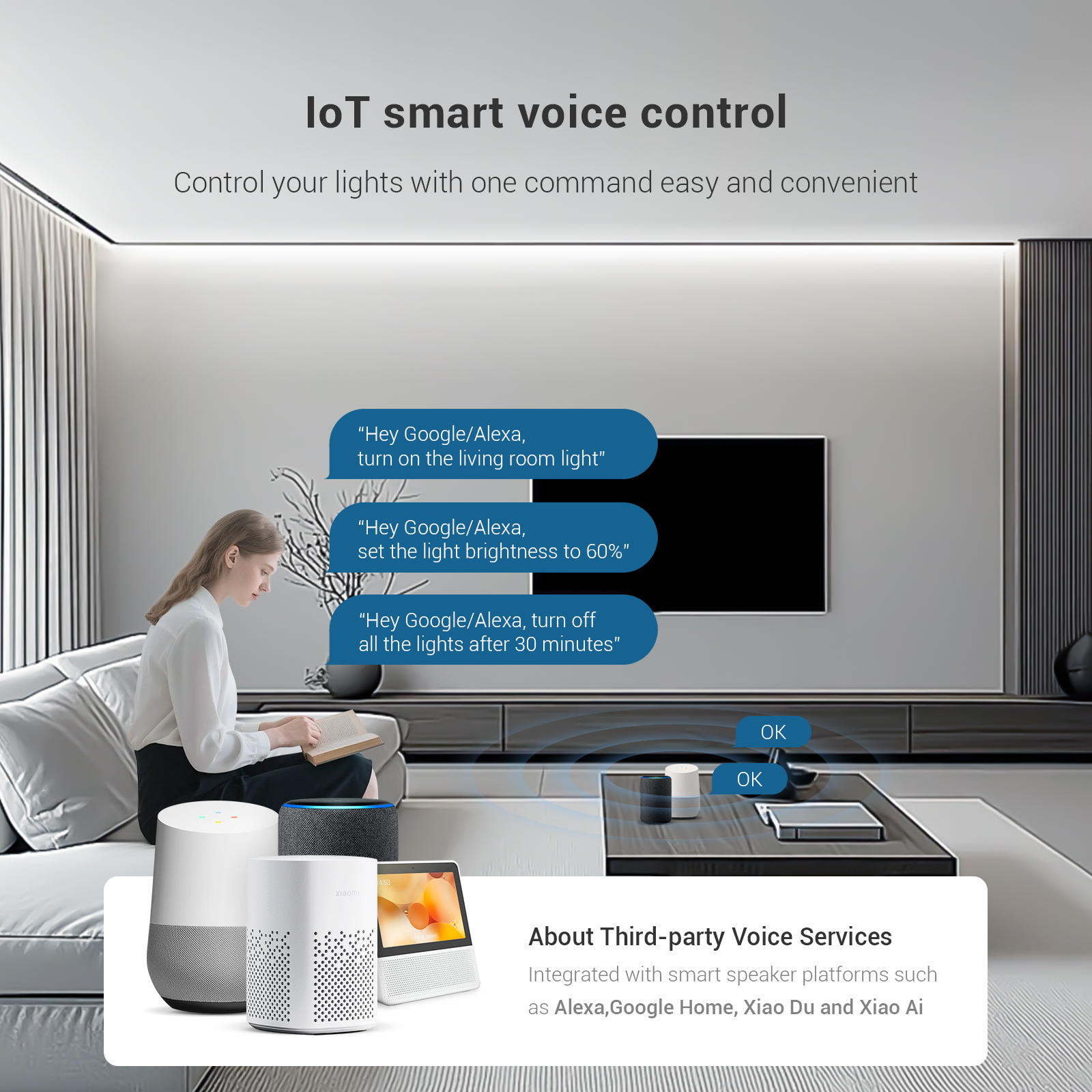Integrated with smart speaker platforms like Alexa,Google Home,XiaoDu,XiaoAi,enabling voice commands for light switches,brightness,and color control.