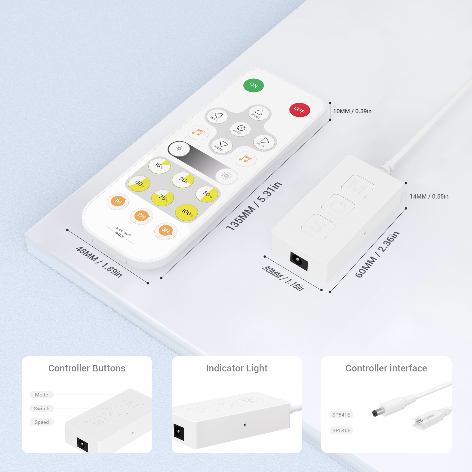 - OFF Button: Short press:Turns off the light. Long press:Within 20 seconds of poweringon the controller,first turn off the light completely,then long-press the “OFF” buttonto clear all paired remote controllers.