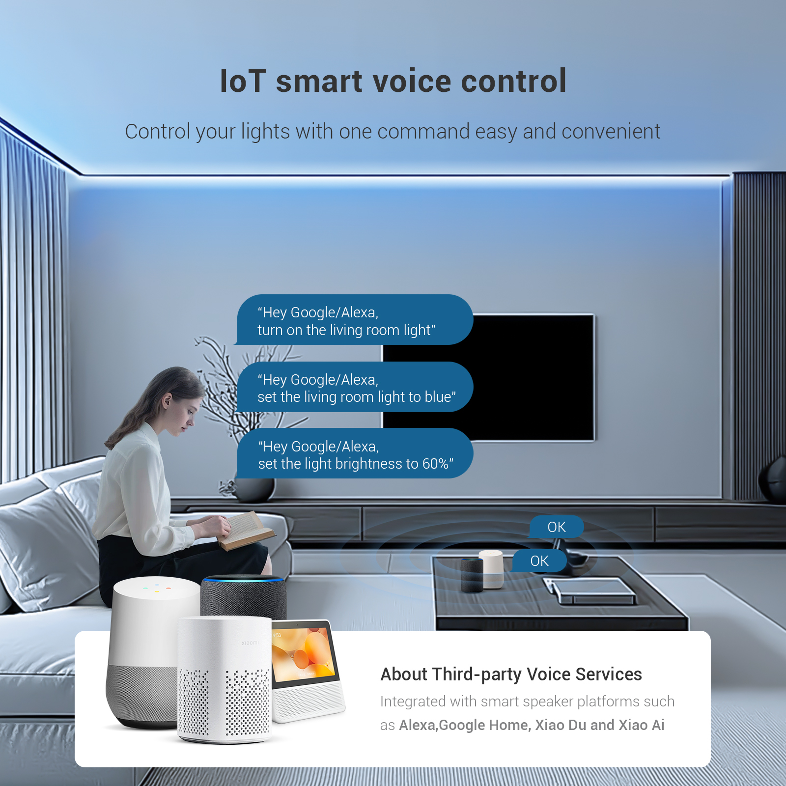 Integrated with smart speaker platforms like Alexa,Google Home,XiaoDu,XiaoAi,enabling voice commands for light switches,brightness,and color control.