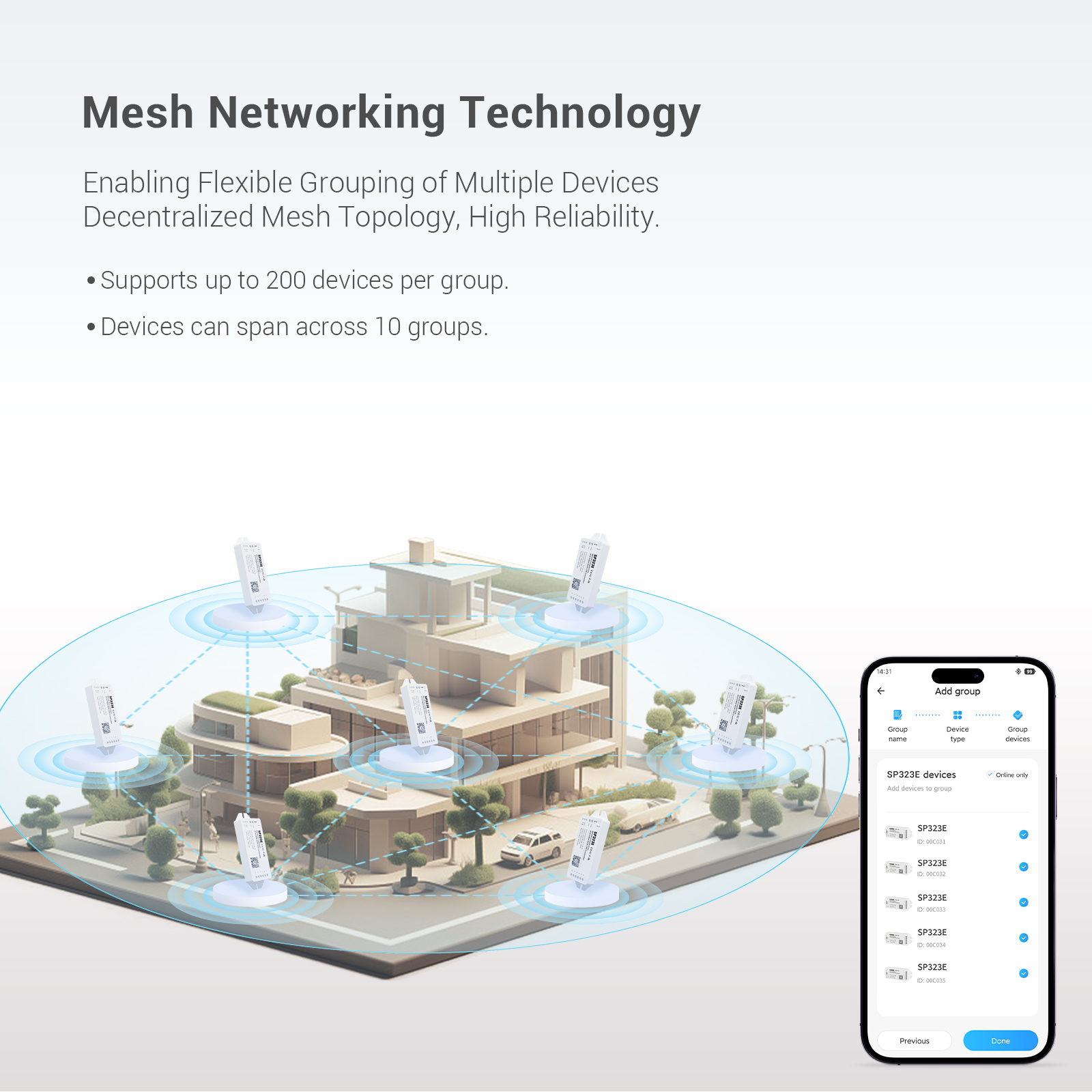 In a Mesh network,two devices in a group can be up to 30 metersapart,and the frame synchronization signal covers a radius of up to260 meters.