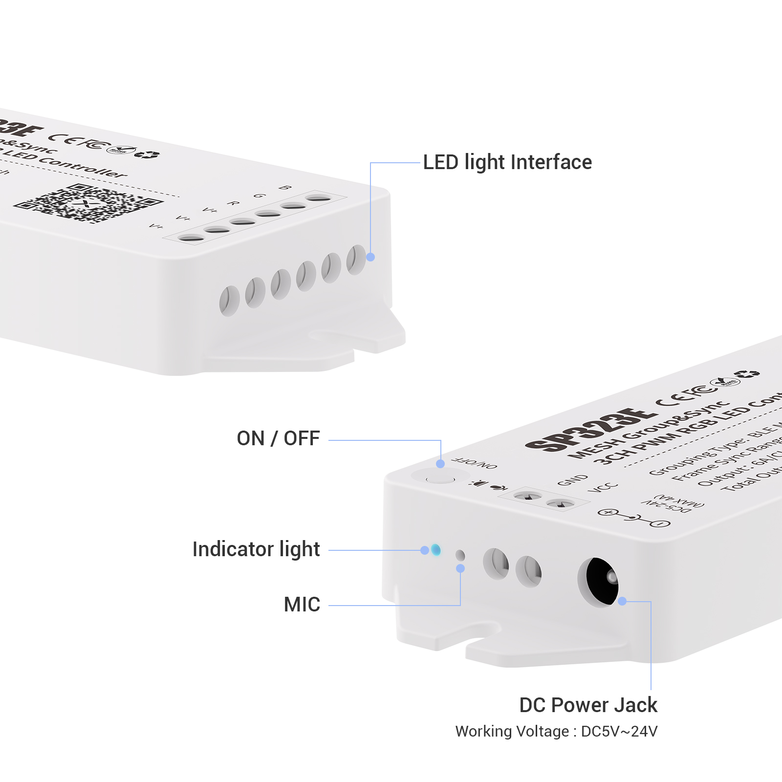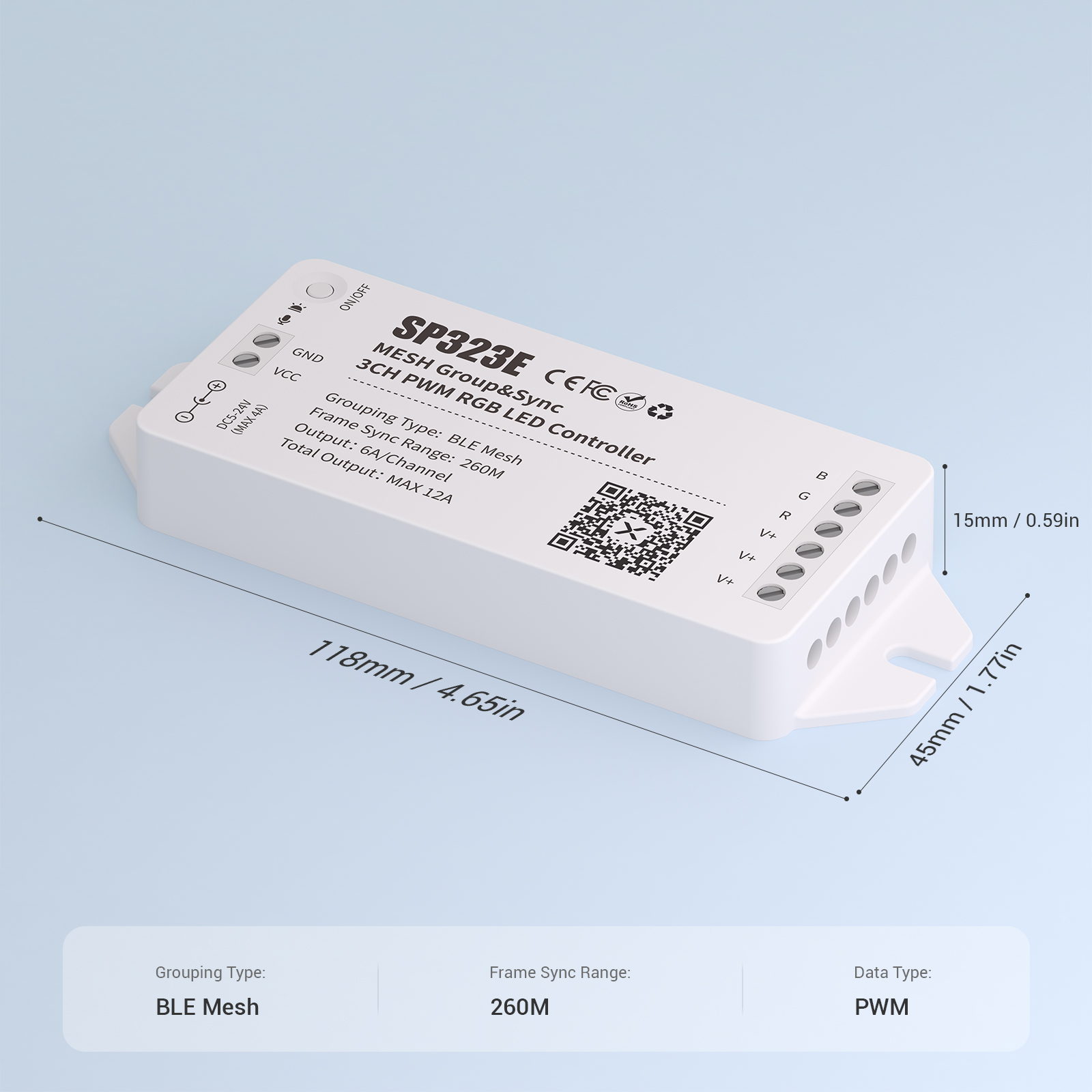 Mesh group network synchronization 3-way PWMRGBLED controller. The controller is equipped with a flexible Bluetooth Mesh (BLE Mesh) group management function, which enables frame synchronization of lighting effects between devices within a radius of 260 meters. It adopts high-frequency PWM dimming technology, which can provide high-quality lighting performance. In addition, the controller also has a dynamic white light effect and music linkage effect, which can meet diverse and flexible lighting needs.