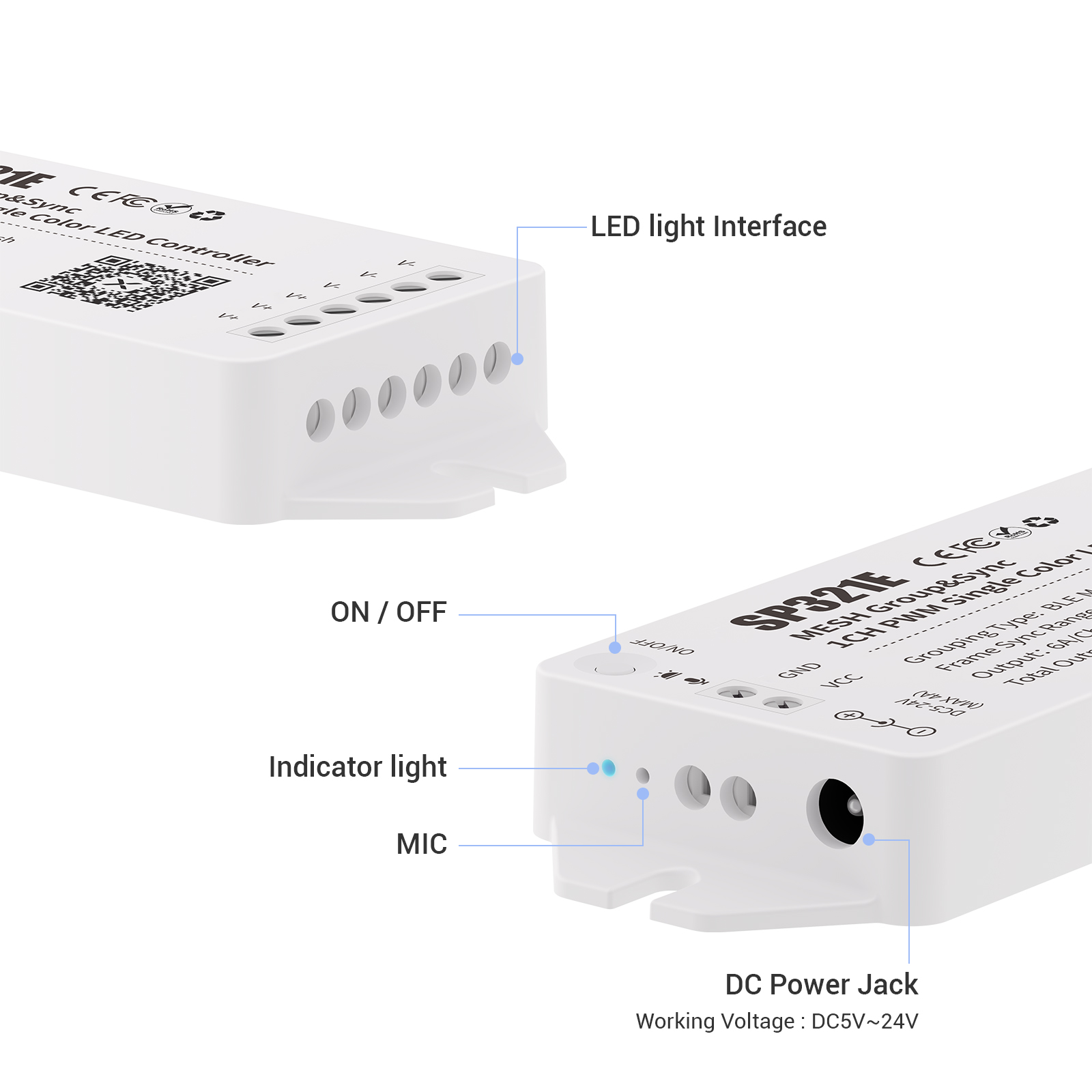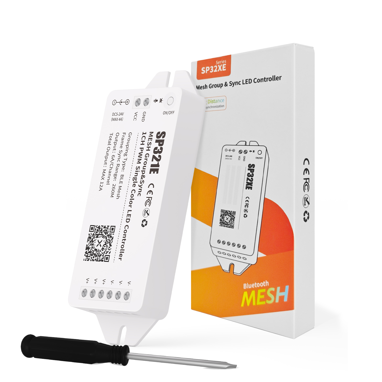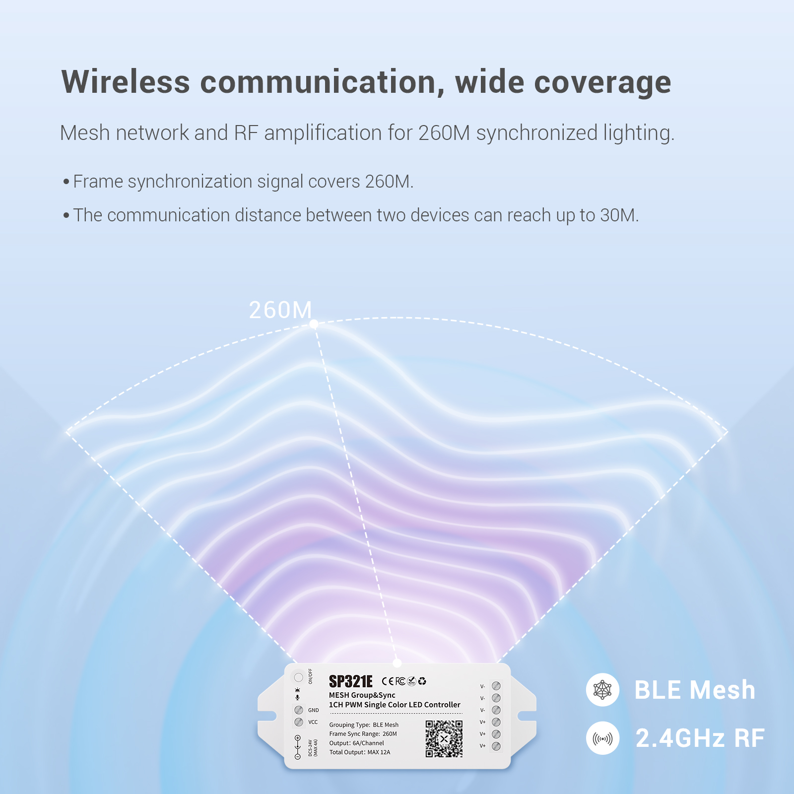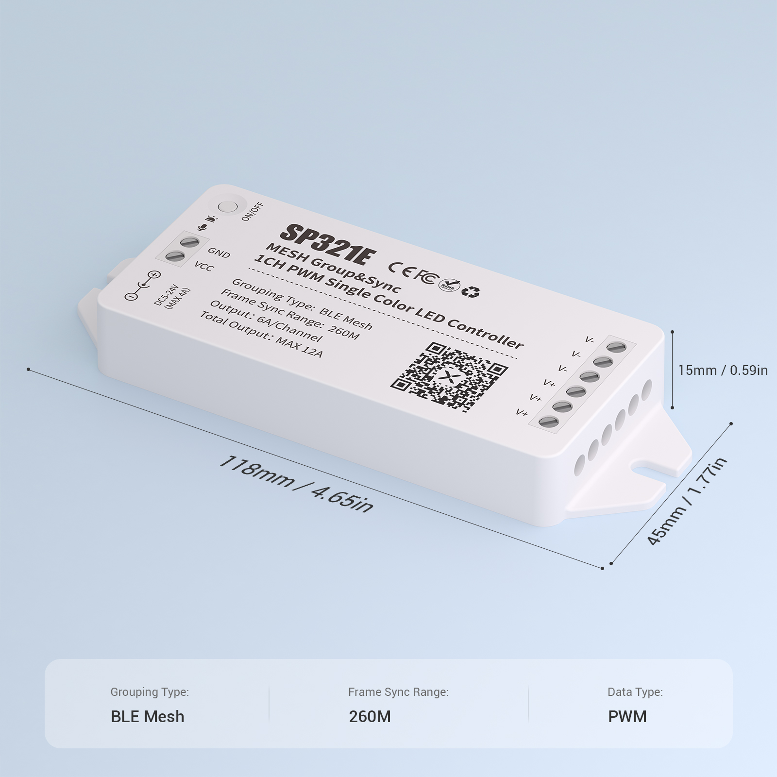 MESH Group&Sync Single-channel PWM Monochrome LED Controller. It is equipped with flexible BLE Mesh group management functions, enabling frame synchronization of lighting effects between devices within a radius of 260 meters. It adopts high-frequency PWM dimming technology to provide high-quality lighting performance. In addition, it features dynamic white light effects and music effects to meet diverse and flexible lighting needs.
