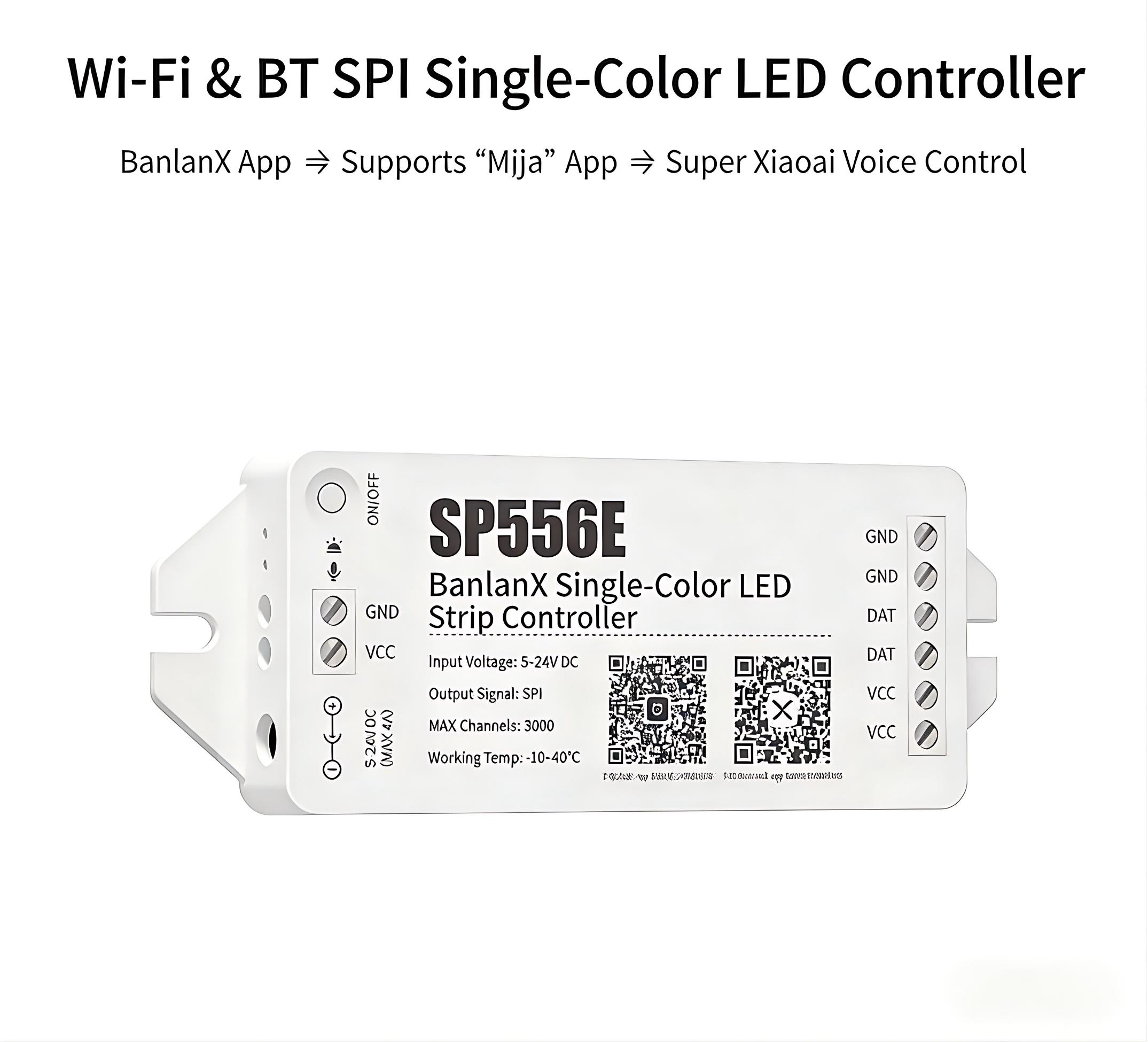 SP556E SPI Single Color LED Controller with Wi-Fi and BT connectivity. It can be directly paired with the “Xiaomi Home” APP without a gateway